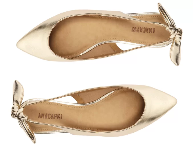 PORQUE APOSTAR: Para trabalhar com estilo! A sapatilha ANACAPRI dourada é aquele modelo que fica no seu pé durante o dia inteiro, do look para o trabalho até o happy com os amigos à noite. Clássico, confortável e super versátil, o modelo é formal na medida enquanto esbanja delicadeza graças ao slingback e a abertura no calcanhar. O bico fino além de ser um clássico atemporal ajuda a alongar a silhueta e desenha o pé de forma delicada. Queridinho número um das descomplicadas!