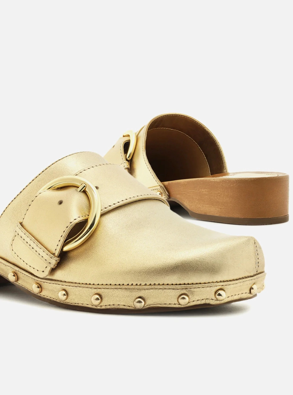 Descrição: Mule Dourada Clog. O modelo tem salto baixo bipartido amadeirado, e bico redondo. Fechado, traz aplicação de tira larga com fivela metálica redonda sobre o cabedal. Com detalhe na base do solado em tachas. Deixa o calcanhar à mostra.
