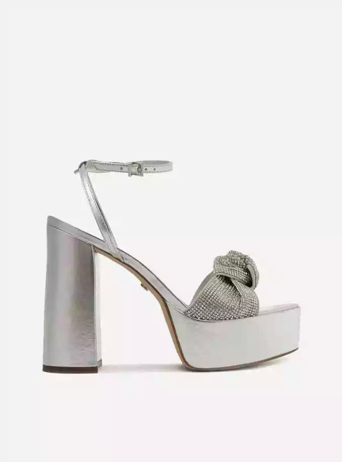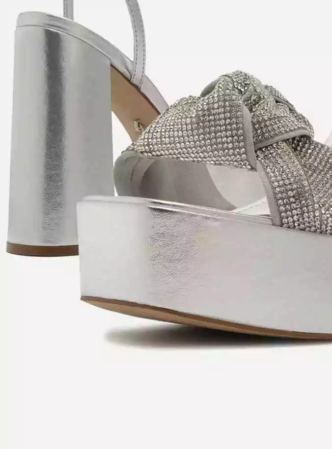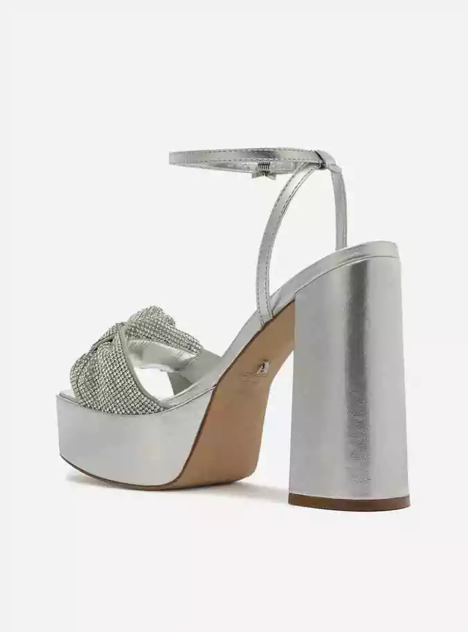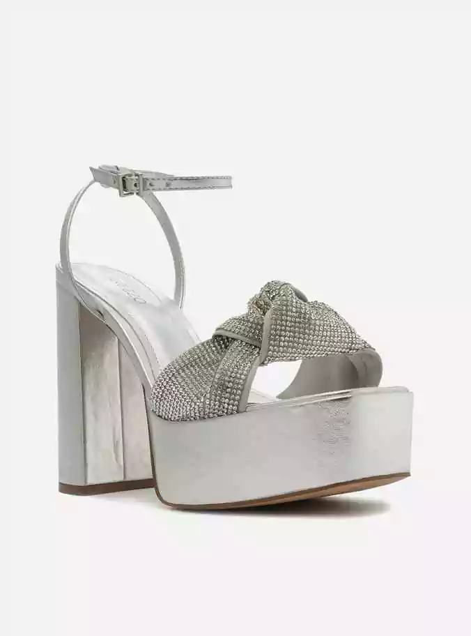 Descrição: Sandália prateada. O modelo tem salto alto bloco e meia-pata da cor da sandália e bico quadrado. Traz tira larga coberta por strass prateado e com um grande nó central sobre os dedos. Aberta, possui tira fina em torno do calcanhar, que se cruza na parte de trás, contorna o tornozelo e fecha em fivela quadrada lateral. A sandália exibe todo o pé. Com palmilha prateada e inscrição do nome da marca.
