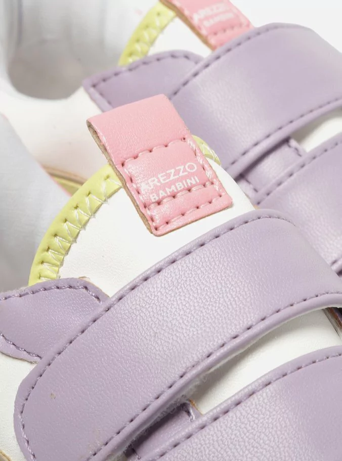 Tênis branco e colorido. O modelo de velcro tem solado alto emborrachado branco com nome da marca na parte traseira. Traz cabedal branco com aplicações em camurcina bege no contorno inferior e em material dourado no calcanhar e na biqueira. De bico redondo, o tênis tem fecho em cadarços brancos e tag em gorgurão preto do nome da marca na língua. Com inscrição metálica Arezzo em alto-relevo na lateral do cabedal. Este modelo faz parte da coleção AREZZO BAMBINI, a linha de calçados infantil da Arezzo.<