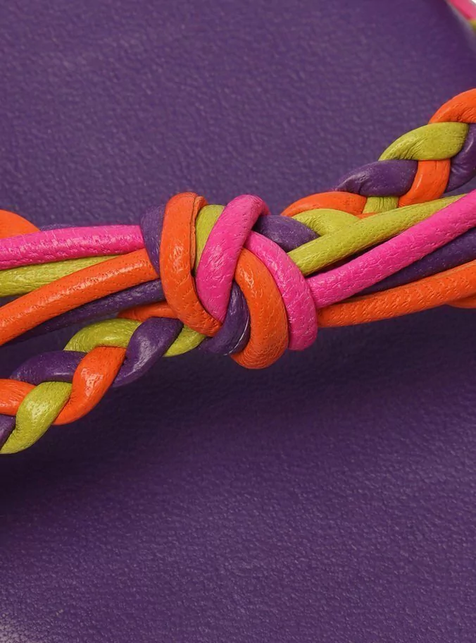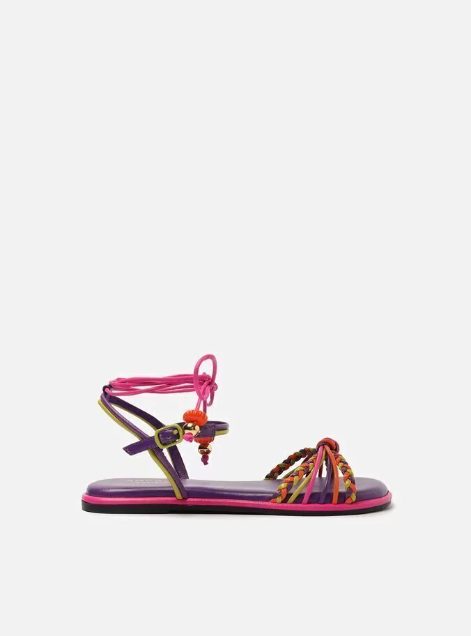 Sandália rasteira colorida. O modelo tem sola flat, palmilha acolchoada e bico quadrado. Traz tiras finas trançadas e coloridas, unidas por nó, sobre os dedos e uma tira em torno do calcanhar. Possui tira afivelada no peito do pé e tira fina com ponteiras e amarração frontal no tornozelo. Aberta, a sandália exibe todo o pé. Este modelo faz parte da coleção AREZZO BAMBINI, a linha de calçados infantil da Arezzo.