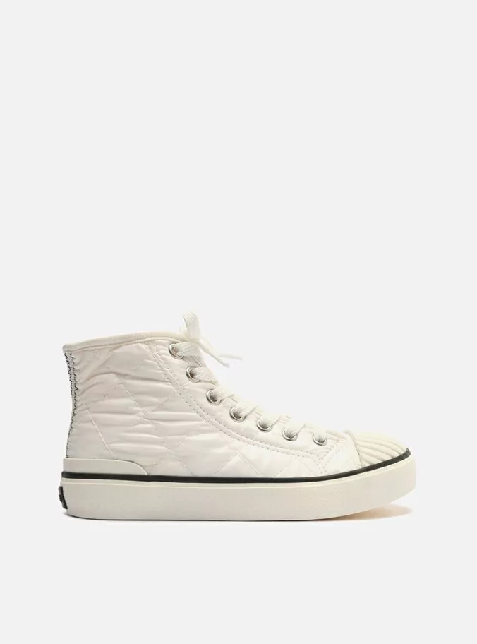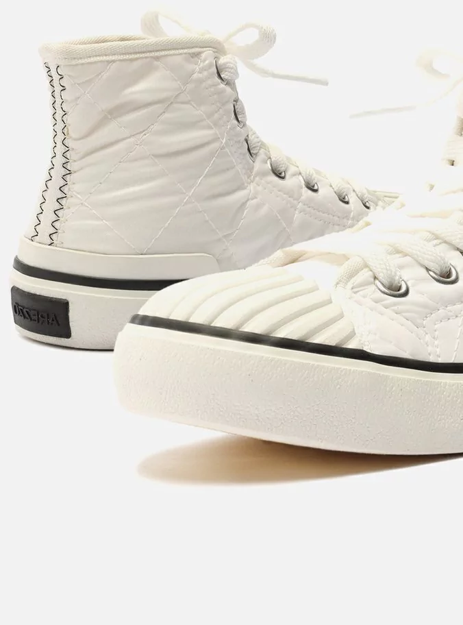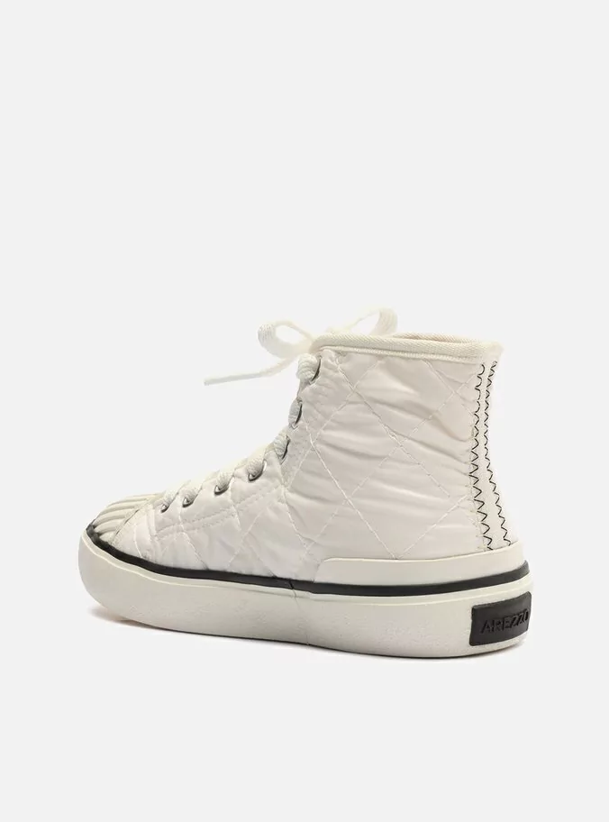 Tênis branco em tecido com costuras em matelassê. O modelo de amarração tem solado baixo emborrachado branco, com biqueira riscada e tag preta do nome da marca. De bico redondo, o tênis possui cano alto, estilo botinha. Com fecho em cadarços brancos e detalhe em gorgurão e costura zigue-zague contrastante na parte traseira do cano. Este modelo faz parte da coleção AREZZO BAMBINI, a linha de calçados infantil da Arezzo.